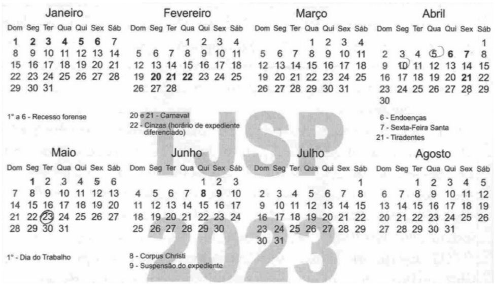 Observação: para contagem do prazo, o candidato deverá utilizar o calendário abaixo, desprezando a existência de quaisquer feriados, suspensão ou recesso forense.